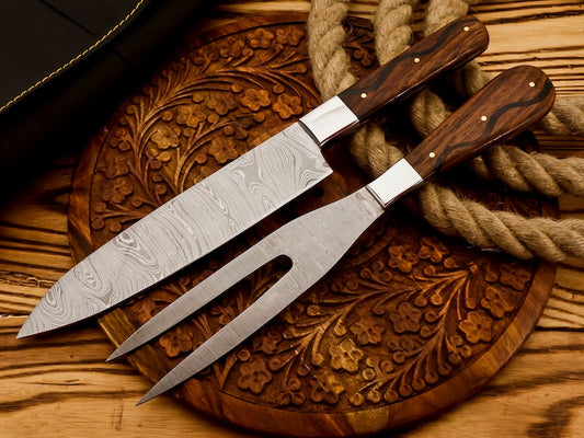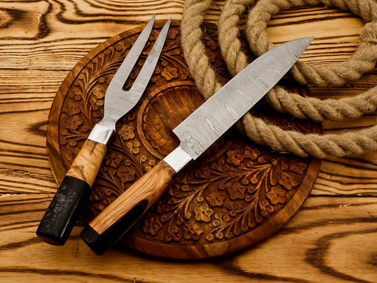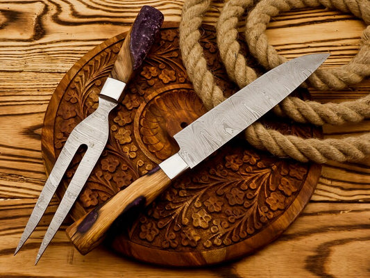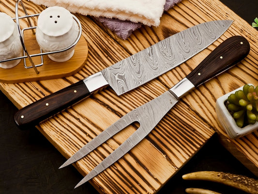 Handmade Damascus Steel Slicing Knife & Fork Set | Best gift for friends