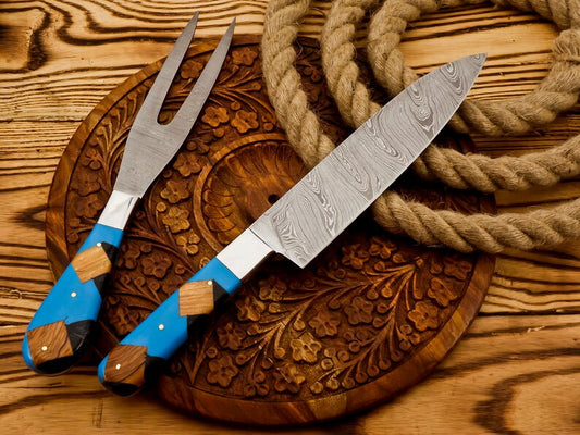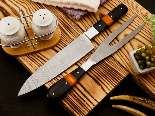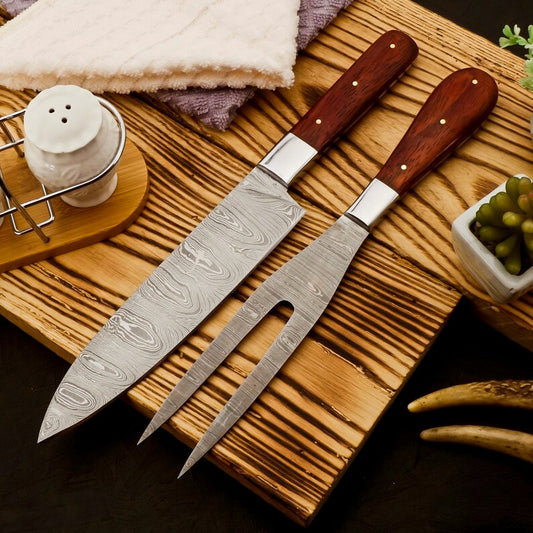 Handmade Damascus Steel Carving Knife Fork Set | BBQ Knife And Fork Set 2PC | best wedding gifts