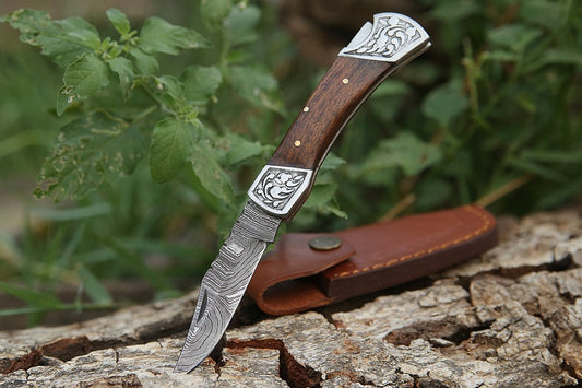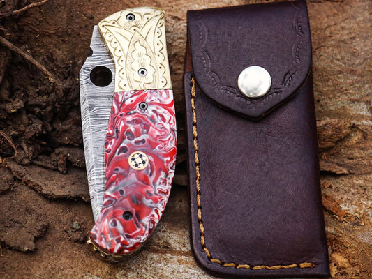 Damascus Folding Knife with Leather cover | Best Camping Knife